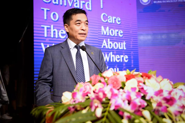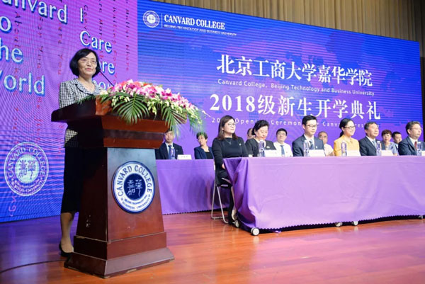 “我由衷感受到‘得天下英才而育之’的快乐。在此,我谨代表北京工商大学嘉华学院全体师生员工、全球嘉华校友,对你们的到来表示最热烈的欢迎!同学们,当你们迈进嘉华学院校门那一刻起,你们的青春和梦想,你们的汗水和泪水,都将刻上嘉华学院的印迹。你们将在这里书写你们新的人生篇章。相信你们的加入,学校因你们而更加精彩,你们也将会在嘉华触及世界,成为最好的自己。国际嘉华已与你牵手,新的人生征程即将起航。青春无畏,也应无怨无悔;学习很累,但奋斗的青春最美。”校长宋国华教授在讲话中向新生提出了三点希望,他希望同学们主动学习、独立思考,增长本领,修身养德,确定目标,全力以赴。