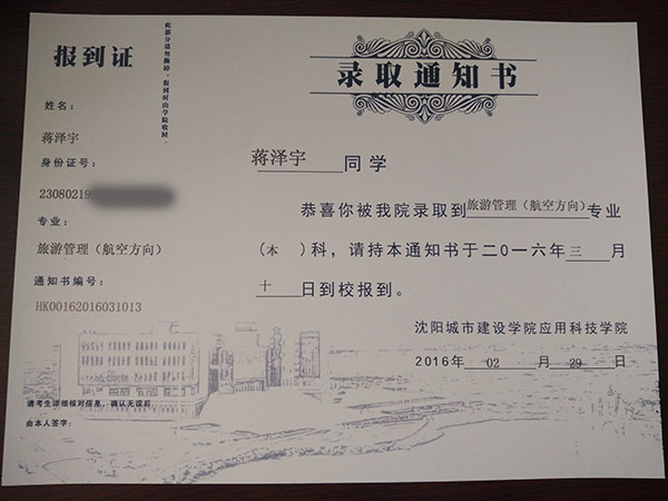 恭喜蒋泽宇同学被我校录取【沈城建航空】