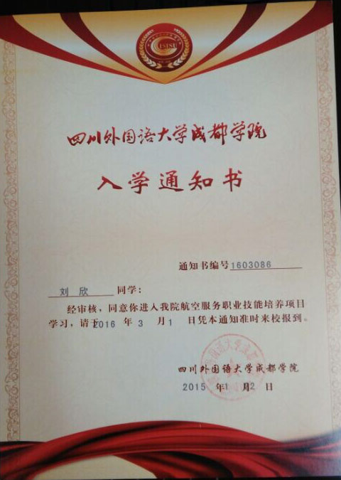 恭喜刘欣同学被我校录取【川外成都航空】