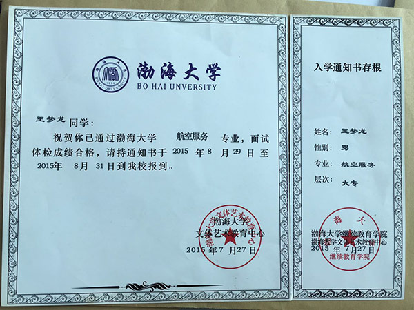 恭喜王梦龙同学被我校录取【渤海大学航空】