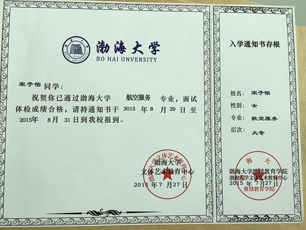 恭喜宋子怡同学被我校录取【渤海大学航空】