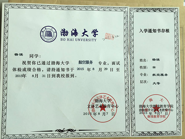 恭喜杨淇同学被我校录取【渤海大学航空】