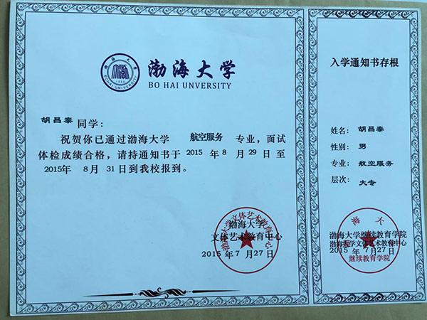 恭喜胡昌泰同学被我校录取【渤海大学航空】