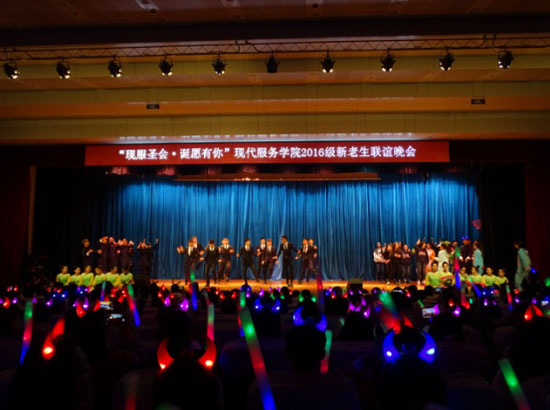 青春筑梦织华章,雨润栋梁遍五湖。2016年12月23日17时在图书馆报告厅,现代服务学院2016年新老生联谊会在师生的热切期盼中如约而至,学院2016级全体新生和部分老生代表参加了本场晚会。校学生处处长周振刚、学生工作部综合管理科科长刘春媚、团委办公室刘宇老师、现代服务学院院长张明明、教学总管肖伟民、物流教研室主任何岩松、学工办主任杨琴及全体辅导员老师共同观看了本场晚会。